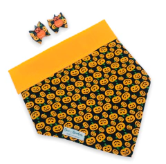 Conjunto bandana Halloween mini abóboras dupla face laranja, e par de lacinhos com elástico liguinha. Bandana pet com regulagem em botões de pressão. Na relação de medidas abaixo você poderá encontrar o tamanho para seu pet, sugerimos utilizar uma fita métrica para medir a circunferência do pescoço e considerar uma folga para ficar confortável no pet. Se não possuir fita métrica pode utilizar a própria coleira ou um barbante e verificar a marcação na régua: